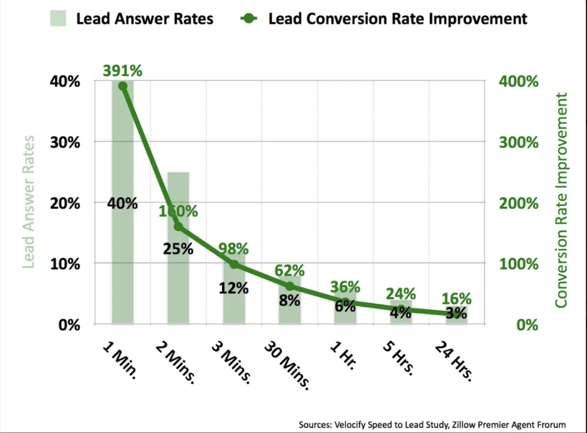 Studies have shown that waiting even just 3 minutes to call back a new lead can lower conversion rates by almost 400%!!